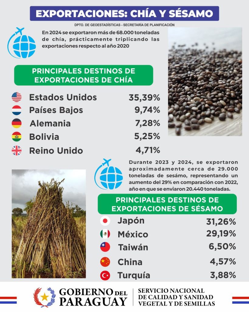 Paraguay se consolida como productor y exportador mundial de chía y sésamo, dos cultivos reconocidos por su alta calidad. Estos rubros han experimentado un crecimiento sostenido en los volúmenes de exportación durante los últimos años, reflejando la creciente demanda en mercados internacionales.
