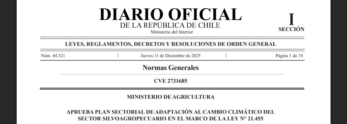 El documento corresponde a un decreto publicado en el Diario Oficial de Chile que aprueba el Plan de Adaptación al Cambio Climático del Sector Silvoagropecuario (PACC SAP) 2024–2028, en el marco de la Ley Marco de Cambio Climático y los compromisos nacionales e internacionales del país.