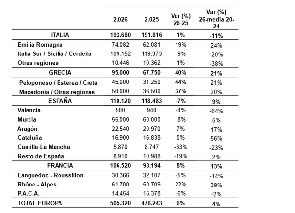 La producción europea de damascos en 2026 alcanzaría 505.320 toneladas, un aumento de 6% respecto a 2025 y de 4% frente al promedio 2020-2024, según datos presentados en el congreso Medfel. Aunque el clima fue menos adverso que el año pasado, heladas puntuales y lluvias durante la floración limitaron parte del potencial productivo. Grecia sería el único país en alcanzar una cosecha considerada normal y claramente superior a la campaña previa.
