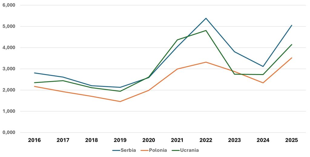 En los últimos 10 años, el valor de las importaciones se ha duplicado y el volumen se ha mantenido sobre las 180 mil toneladas, entre los principales países que abastecen el mercado francés en frutas congeladas tenemos Polonia, Serbia, España, Bélgica, Marruecos y Egipto. Al desglosar por las partidas arancelarias, en el HS code 081120 los principales proveedores son Polonia, Serbia y Ucrania, en la partida 081110 los principales proveedores son Polonia, Egipto, Marruecos y España, y finalmente para la partida 081190 los principales proveedores son España, Bélgica, Polonia, Portugal y Marruecos.