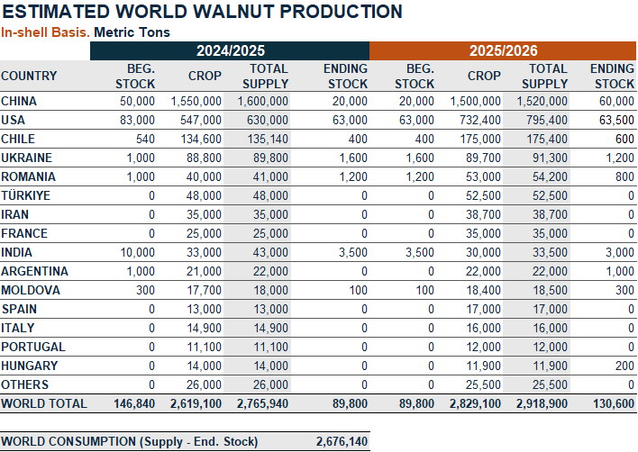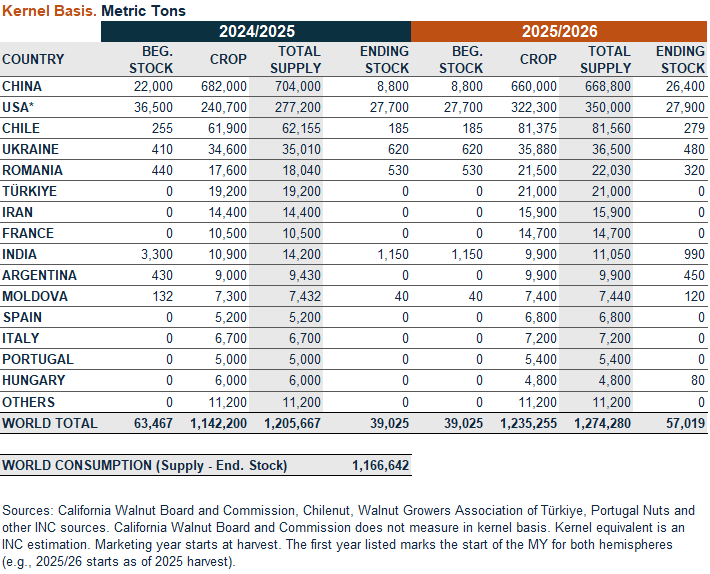 De acuerdo a las últimas estadísticas al mes de marzo 2026 publicadas por la Interantional Nut and Dried Fruit Council (INC) señala que el mercado global de nueces muestra para la temporada 2026 un panorama heterogéneo según el origen. En China, se observa una menor cosecha, junto con menores inventarios iniciales y una fuerte demanda temprana, impulsó los precios entre un 20% y 30% interanual. Además, se observó un aumento significativo en los envíos de nueces sin cáscara (kernel), mientras que los embarques con cáscara disminuyeron, reflejando dinámicas comerciales más complejas en el mercado.