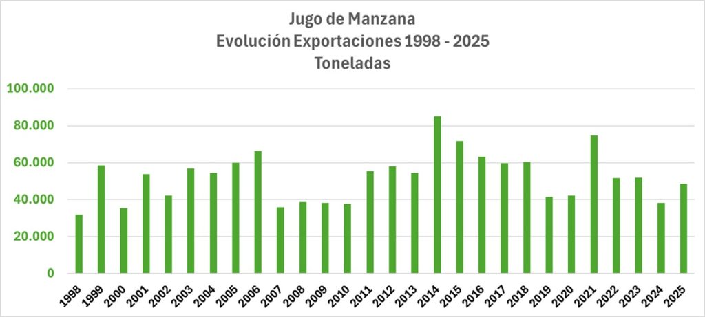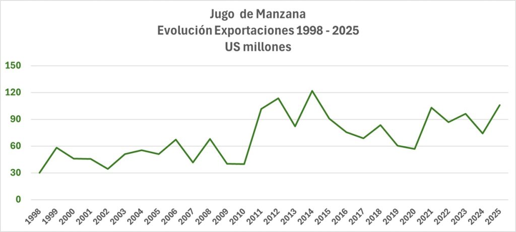 Entre enero y diciembre de 2025, los envíos nacionales de jugo de manzana alcanzaron un valor total de 106 millones de dólares. Esto representa un aumento del 43% respecto al año anterior, ubicándose en los registros históricos de exportaciones de este producto.