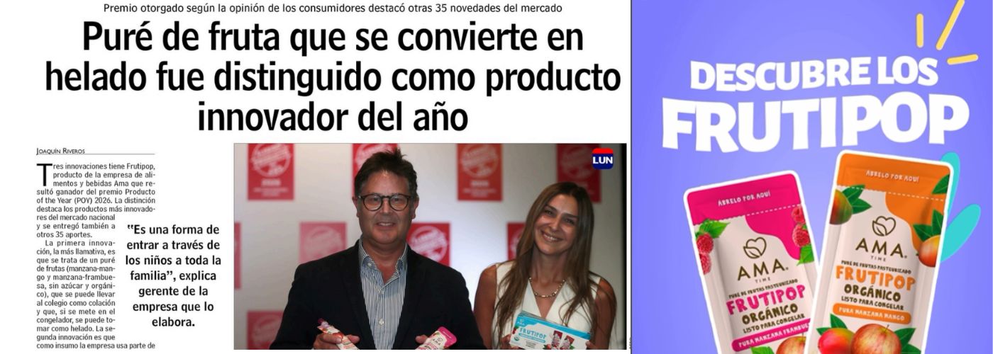AMA Time recibió un premio especial para su producto Frutipop, por ser el que mejor representa los Objetivos de Desarrollo Sostenible, según el Comité de Expertos de Producto del Año. El diario Las Últimas Noticias destacó en un reportaje este premio y describe el nuevo producto galardonado..