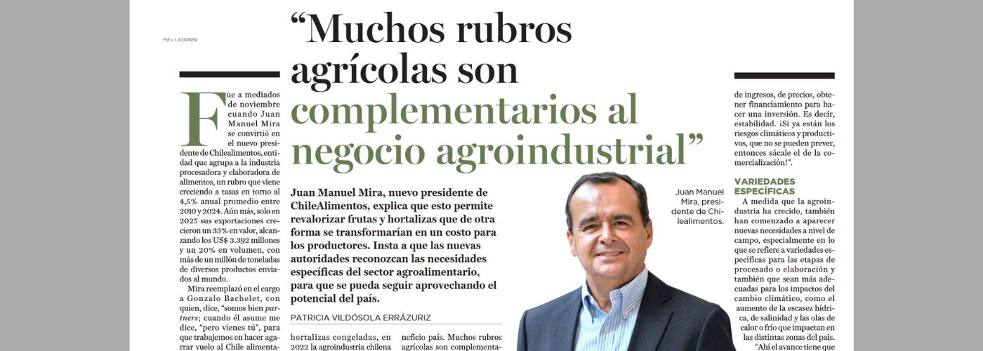 Fue a mediados de noviembre cuando Juan Manuel Mira se convirtió en el nuevo presidente de Chilealimentos, entidad que agrupa a la industria procesadora y elaboradora de alimentos, rubro que viene creciendo a tasas en torno al 4,5% anual promedio entre 2010 y 2024. Aún más, solo en 2025 sus exportaciones crecieron un 33% en valor, alcanzando los US $3.392 millones y un 20% en volumen, con más de un millón de toneladas de diversos productos enviados al mundo.