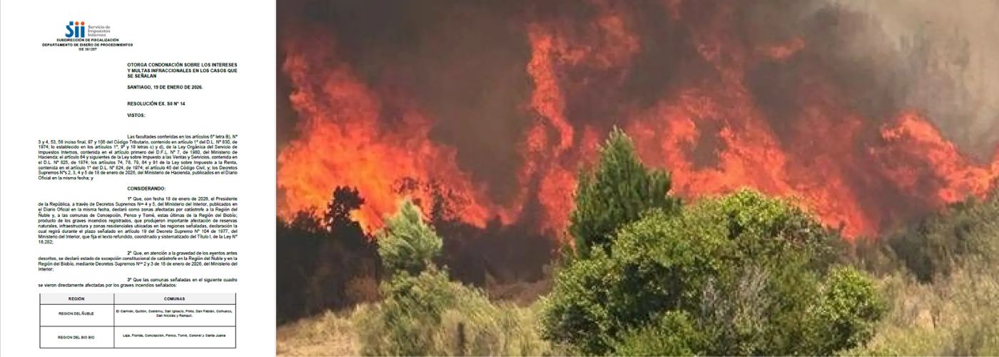 El Servicio de Impuestos Internos ha dictado medidas tributarias excepcionales para contribuyentes afectados por los incendios en las regiones de Ñuble y Biobío. Son la Resolución N°14 y la Circular N°4, cuyos principales efectos son los siguientes: