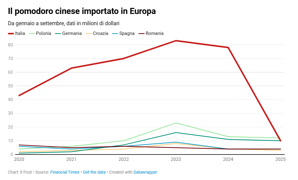 Desde 2015, varias investigaciones periodísticas han revelado cómo parte de la industria italiana, líder mundial en la producción de purés y salsas de tomate, había comenzado a importar pasta de tomate de China, producida industrialmente mediante procesos que eliminan gran parte del agua de los tomates, concentrando así su sabor, color y propiedades nutricionales. Tras examinar la compleja documentación de importación y los datos aduaneros, se descubrió que decenas de miles de toneladas de pasta de tomate producida en la región china de Xinjiang llegaban mensualmente a puertos italianos.
